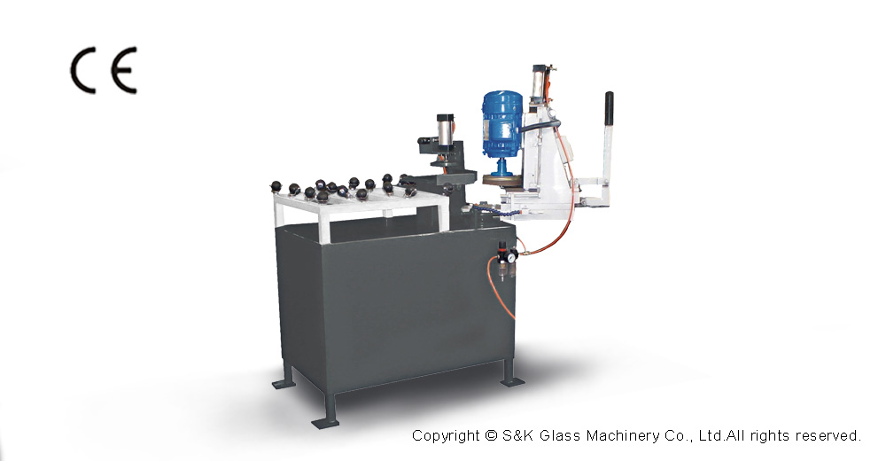 sta máquina utiliza un cilindro neumático o una ventosa para apretar. Puede levantar el cabezal de rectificado neumáticamente. Al mismo tiempo, se instalan dos muelas para rectificado, rectificado y pulido. El vidrio se puede formar en ángulo recto: redondo, cuadrado, pico de pato, etc.